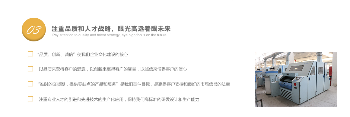 太倉市高陽工貿有限公司是專業從事特種紗生產十數年的一線生產廠家,坐落于江蘇省蘇州市太倉市雙鳳鎮新湖建湖路29號,太倉隸屬長江三角洲經濟圈,交通便捷,經濟發達,是著名的紡織生產基地。 公司歷史要追溯到1982年就成立的新湖毛紡織廠。1996年,毛紡織廠與上海二十二棉在新湖聯合組建了太倉市新湖福利綜合廠。2002年為適應市場的飛速變化,公司轉制重組更名為太倉市高陽工貿有限公司。同時公司適時調整生產經營策略,調整產品品種結構,把生產特種紗作為主要發展方向,純棉、滌綸竹節紗是我們的主要產品。 公司多年來始終保持了持續穩定發展的良好勢頭,在激烈的市場競爭中發展壯大,不斷前行。我們把“走品牌發展之路,創紗線知名商標”作為公司持續發展的核心戰略。以市場為導向,堅持“以品種求發展,以質量求生存”的方針,以增強市場競爭力為中心,對不斷變化的市場環境作出快速反應,品牌戰略的實施。公司注重專業人才的引進和先進技術的生產化應用,具備較強的研發設計和生產能力。 公司一直把“品質、創新、誠信”作為企業文化建設的核心。以品質來獲得客戶的滿意,以創新來贏得客戶的贊賞,以誠信來博得客戶的信心。我們把“準時的交貨期,提供零缺點的產品和服務”作為奮斗目標,贏得了客戶的支持和良好的市場信譽。 高陽工貿有限公司愿與廣大客戶加強合作,共享信息,迎接挑戰,共同發展??蛻粜枨蟆A私庠敿?>